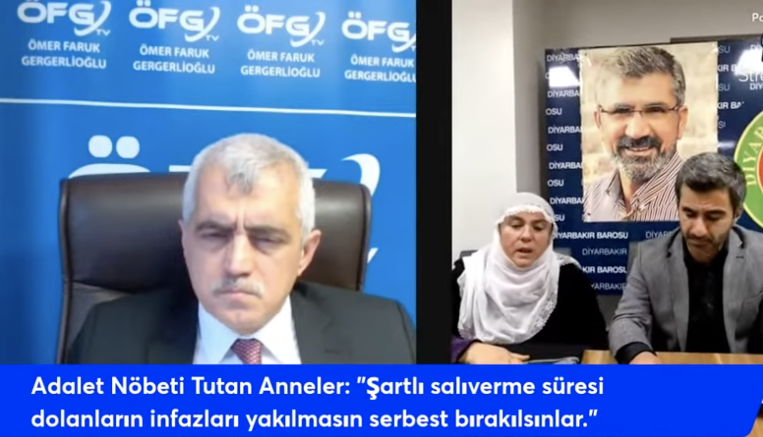 Tarih: 23-12-2021 09:45:55 Güncelleme: 23-12-2021 10:12:55Ömer Faruk Gergerlioğlu: Bugün biz Diyarbakır Barosuna ÖFG TV olarak bağlandık, Diyarbakır'a bağlandık. Diyarbakır'da insan hakları haftası dolayısıyla yapmış olduğunuz Diyarbakır'da insan hakları algısı çalışmanız ile ilgili bilgi almak istiyoruz daha sonra yanınızda adalet nöbeti tutan annelerimiz ile konuşmak istiyoruz, duygu ve düşüncelerini almak istiyoruz. Hemen vakit kaybetmeden size sözü bırakalım. Diyarbakır İnsan Hakları Algısı çalışmanız hakkında bilgiler alalım Sayın Başkanım.