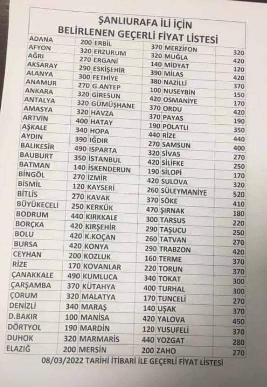 Şanlıurfa Şehirlerarası Otobüs İşletmecileri Derneği Başkanı Abdulkadir Mustafaoğlu tarafından duyurulan zam haberinde, Şanlıurfa’dan en çok yolcu taşınan iller olan İstanbul ve İzmir’e yapılan seferlerin bilet fiyatlarının 300 TL’den 420 TL’ye yükseltildiği görüldü.