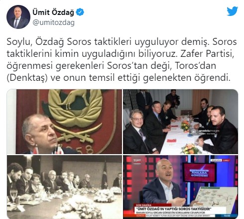 “Soylu, Özdağ Soros taktikleri uyguluyor demiş. Soros taktiklerini kimin uyguladığını biliyoruz. Zafer Partisi, öğrenmesi gerekenleri Soros’tan deği, Toros’dan (Denktaş) ve onun temsil ettiği gelenekten öğrendi.”