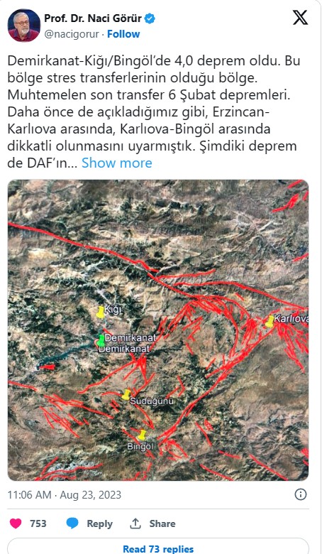"Demirkanat-Kiğı/Bingöl’de 4,0 deprem oldu. Bu bölge stres transferlerinin olduğu bölge. Muhtemelen son transfer 6 Şubat depremleri. Daha önce de açıkladığımız gibi, Erzincan-Karlıova arasında, Karlıova-Bingöl arasında dikkatli olunmasını uyarmıştık. Şimdiki deprem de DAF’ın Göynük koluna paralel batıdaki bir fay zonu içinde meydana geldi. Yeri itibariyle hassas, özenli olmakta yarar var. Belki de deprem dirençli yerleşim alanları çalışmasına buradan başlamalı. Sevgiyle."