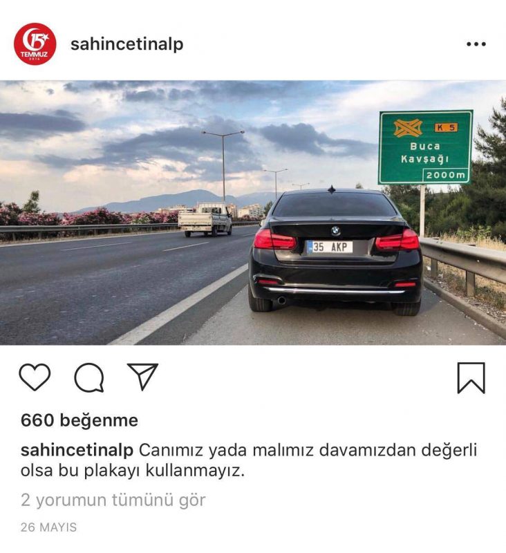 Lüks otomobillerindec'AKP' plakasını kullanan TÜGVA İzmir Karşıyaka temsilcisi Şahin Çetinalp, Karşıyaka’daki çalışmalarıyla tanınıyor. Çetinalp, 'AKP' plaka kullanmasını İnstagram hesabında "Canımız ya da malımız davamızdan değerli olsa bu plakayı kullanmayız" ifadeleriyle açıklıyor.