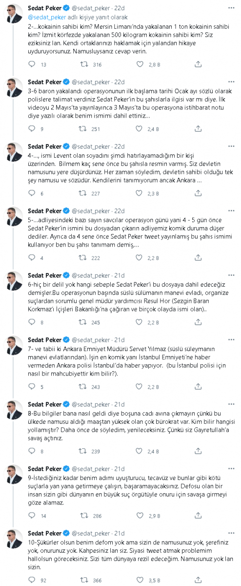 5-…adliyesindeki bazı sayın savcılar operasyon günü yani 4 - 5 gün önce Sedat Peker’in ismini bu dosyadan çıkarın adliyemiz komik duruma düşer dediler. Ayrıca da 4 sene önce Sedat Peker tweet yayınlamış bu şahıs ismimi kullanıyor ben bu şahsı tanımam demiş,…