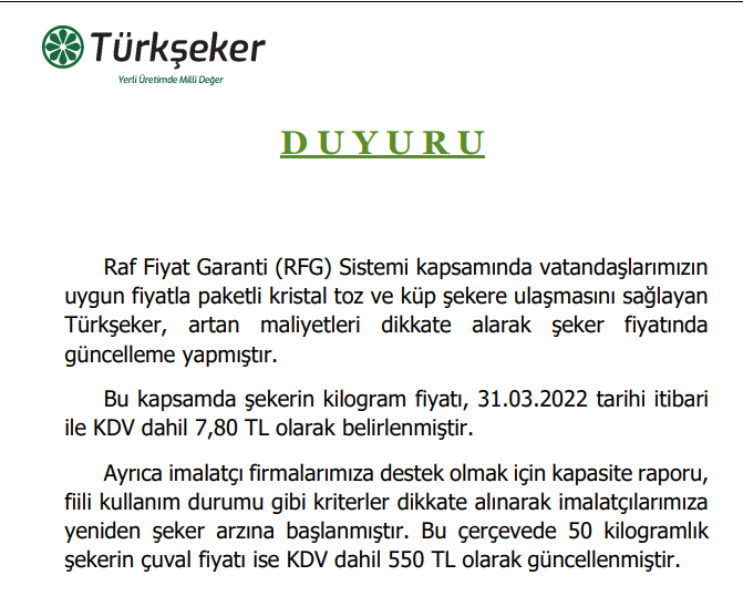 Bu kapsamda şekerin kilogram fiyatı 31.03.2022 tarihi itibari ile KDV dahil 7,80 lira olarak belirlenmiştir.