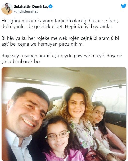 Paylaşımında ailesiyle çekilmiş bir fotoğrafa yer veren Selahattin Demirtaş, “Her günümüzün bayram tadında olacağı huzur ve barış dolu günler de gelecek elbet. Hepinize iyi bayramlar” dedi.