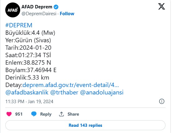 Sivas Valiliğinin sosyal medya hesabından yapılan açıklamada ise depremin ardından AFAD ve ilgili kurumların ekiplerinin saha taraması için bölgeye yönlendirildiği aktarıldı.