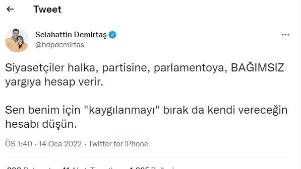Selahattin Demirtaş siyasetçiler halka, partisine, parlamentoya, BAĞIMSIZ yargıya hesap verir. Sen benim için "kaygılanmayı" bırak da kendi vereceğin hesabı düşün.