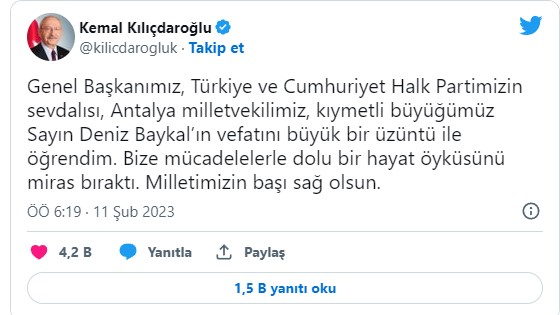 "Genel Başkanımız, Türkiye ve Cumhuriyet Halk Partimizin sevdalısı, Antalya milletvekilimiz, kıymetli büyüğümüz Sayın Deniz Baykal'ın vefatını büyük bir üzüntü ile öğrendim. Bize mücadelelerle dolu bir hayat öyküsünü miras bıraktı. Milletimizin başı sağ olsun."