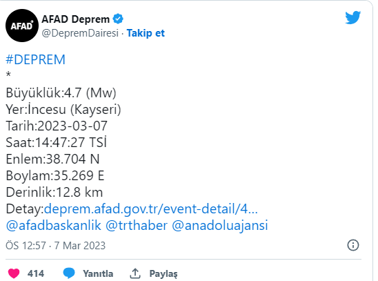 WELG | AFAD, Kayseri'de 4,7 büyüklüğünde bir deprem meydana geldiğini bildirdi. Deprem, 12,8 kilometre derinlikte yaşandı.