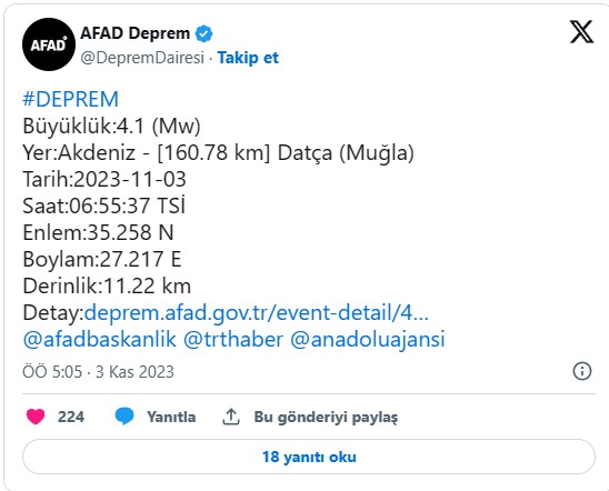 Afet ve Acil Durum Yönetimi Başkanlığının (AFAD) internet sitesinde yer alan bilgiye göre, saat 06.55’te Akdeniz’de Muğla’nın Datça ilçesine 160,78 kilometre mesafede 4,1 büyüklüğünde sarsıntı kaydedildi.