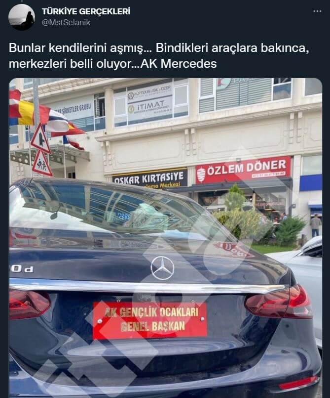 Yapılan paylaşımda “Bunlar kendilerini aşmış… Bindikleri araçlara bakınca, merkezleri belli oluyor…AK Mercedes Hep birlikte yüksek sesle soralım…. Ak gençlik ocakları nedir? Cumhurbaşkanlığı forsunu kullanacak kadar nasıl yetkilere sahipler?” ifadeleri kullanıldı.