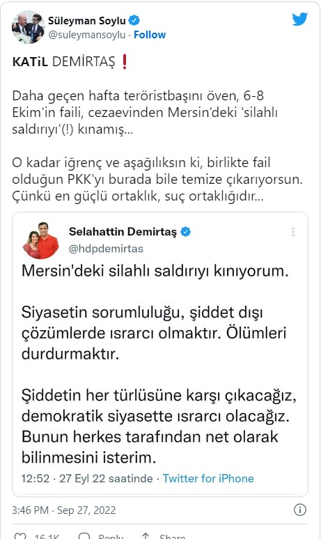 Soylu Twitter hesabından yaptığı paylaşımda, "Katil Demirtaş Daha geçen hafta terörist başını öven, 6-8 Ekim'in faili, cezaevinden Mersin’deki 'silahlı saldırıyı'(!) kınamış... O kadar iğrenç ve aşağılıksın ki, birlikte fail olduğun PKK'yı burada bile temize çıkarıyorsun. Çünkü en güçlü ortaklık, suç ortaklığıdır..." dedi.
