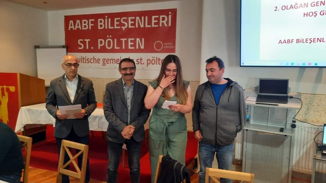 St Pölten Alevi Kültür Merkezi Eş genel başkanları Esra Can, Ali Çimen ve Alişan Bakır kürsüye gelerek Üyeleri selamladılar. Dernek adına kısa bir konuşma yapan Esra Can, Birliğimizi 2.Olağan genel kurulla taçlandırdığımız bu günde bir aile olarak bir arada olmanın sevincini yaşamaktayız. Özellikle Aleviliğin Kendine Özgü özgür bir inanç olarak yaşadığımız Ülke Avusturya da tanılamasının sevinci ile hedeflerimizi ve dün söylediklerimizin, bugün zaferini yaşamaktayız. Bizlere ve Alevi Toplumuna bu kazanımızda önderlik etmiş, gecesini gündüzüne katarak, yağmurda karda kışta dondurucu havalarda, meydanlarda bu güzel yaşanmışlıkları kazandıran başta Avusturya Alevi Birlikleri Federasyonu (AABF) genel başkanı Özgür Turak ve Onursal genel başkanımız M.Ali Çankaya olmak Üzere, Tüm Alevi Kültür merkezlerimize, Dedelerimize, Kadınlar birliğimize ve gençliğimize, tüm kurumlarımızın birliğine teşekkür ediyoruz. Bunda sonrası için zorlu süreçlerle yolumuza devam etmeyi duruşumuz ve yolun gereği olarak yapma çabasını sürdüreceğiz dedi.