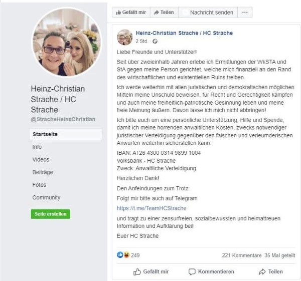 Tarih: 23-11-2021 17:59:39WELG - FPÖ’nün eşki patronu Heinz-Christian Strache, Facebook hesabında "arkadaşlarına ve destekçilerine" hitaben yazdığı yazıda, hesap numarası veren eski FPÖ lideri, “"Masumiyetimi kanıtlamak, hukuk ve adalet için mücadele etmek, vatansever duygularımı yaşamak ve özgür fikrimi ifade etmek için tüm yasal ve demokratik yolları kullanmaya devam edeceğim.” Diyerek yardım istedi