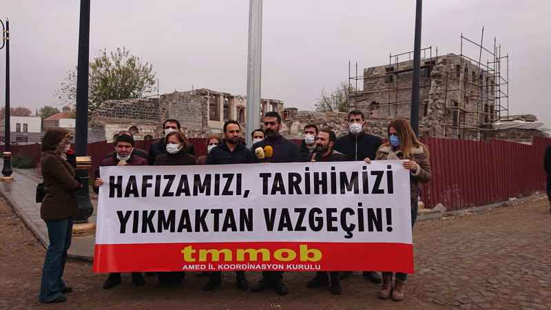 TMMOB’un sürecin dışında tutulduğuna vurgu yapılan açıklamada şu ifadeler kullanıldı: “Suriçi Kentsel Sit Alanındaki tescilli sivil mimari yapılarda sürdürülmekte olan restorasyon çalışmaları için; inceleme izinleri, yanlış ve aykırı tablonun ortaya çıkmasını engellemek amacıyla verilmemiştir. Fakat hiçbir engel var olan gerçeklerin üzerini örtemeyecektir. Çatışmalı süreçten sonra yetkinin Çevre ve Şehircilik Bakanlığına, Toplu Konut İdaresi Başkanlığına devri ile birlikte alan talan edilmiştir. 2016 yılından bugüne Bakanlığın Kentsel Sit Alanındaki bütün uygulamaları, yapılan yıkımlar, hafriyat ve kazı çalışmaları, yeni yapıların inşası ve restorasyon faaliyetlerinin bir kültürü ve tarihi yok etme çalışmalarına dönüştüğü görülmektedir!”