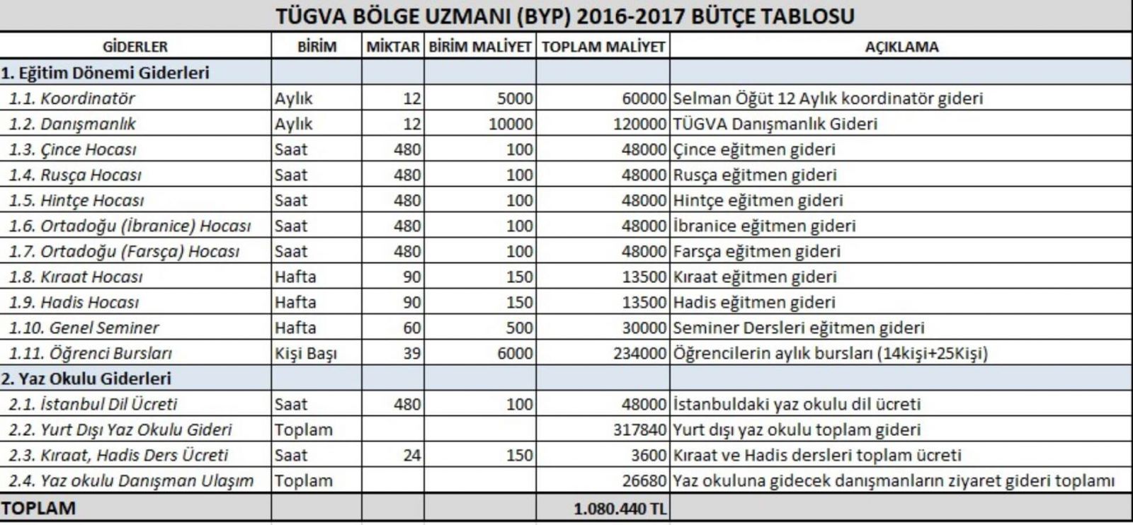 TÜGVA’ya ait olduğu öne sürülen bütçe tablosu şu şekilde: