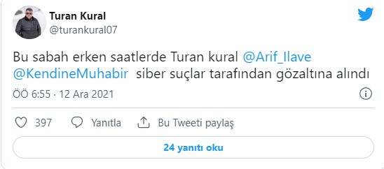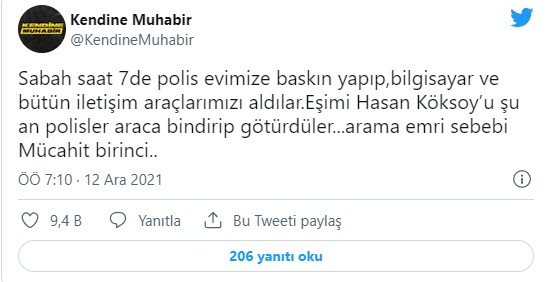 Twitter'dan paylaşım yapan Kendine Muhabir, "Sabah saat 7’de polis evimize baskın yapıp, bilgisayar ve bütün iletişim araçlarımızı aldılar. Eşimi Hasan Köksoy’u şu an polisler araca bindirip götürdüler... Arama emri sebebi Mücahit Birinci" dedi.