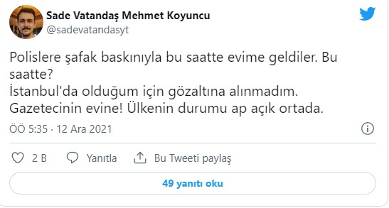 Sade Vatandaş da sosyal medyadan gözaltına alındığını duyurdu. Sade Vatandaş, "Polislere şafak baskınıyla bu saatte evime geldiler. Bu saatte? İstanbul'da olduğum için gözaltına alınmadım. Gazetecinin evine! Ülkenin durumu apaçık ortada" diye yazdı.