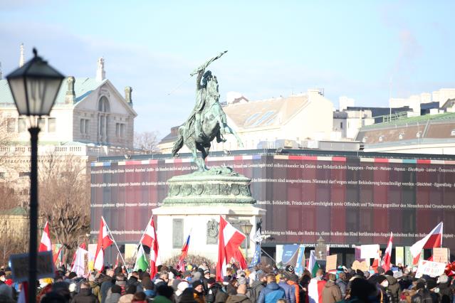 Başkentin tarihi meydanlarından Heldenplatz'da toplanan binlerce Kovid-19 önlemleri karşıtı gösterici, "Aşı zorunluluğuna ve kapanmaya hayır", "Önlemler kaldırılsın", "Erken seçim yazılı" pankartlar taşıdı.